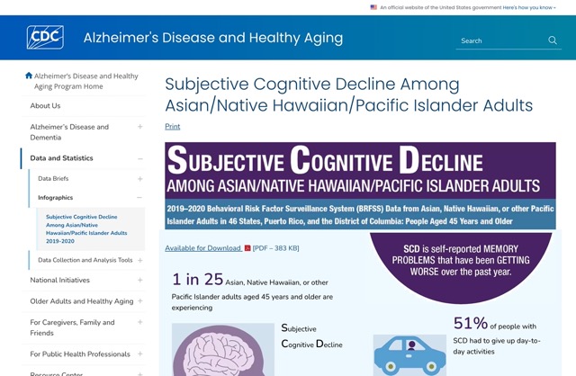 1 in 25 Asian, Native Hawaiian, or other Pacific Islander adults experience subjective cognitive decline. Check out the tailored brain health resource below for more information: